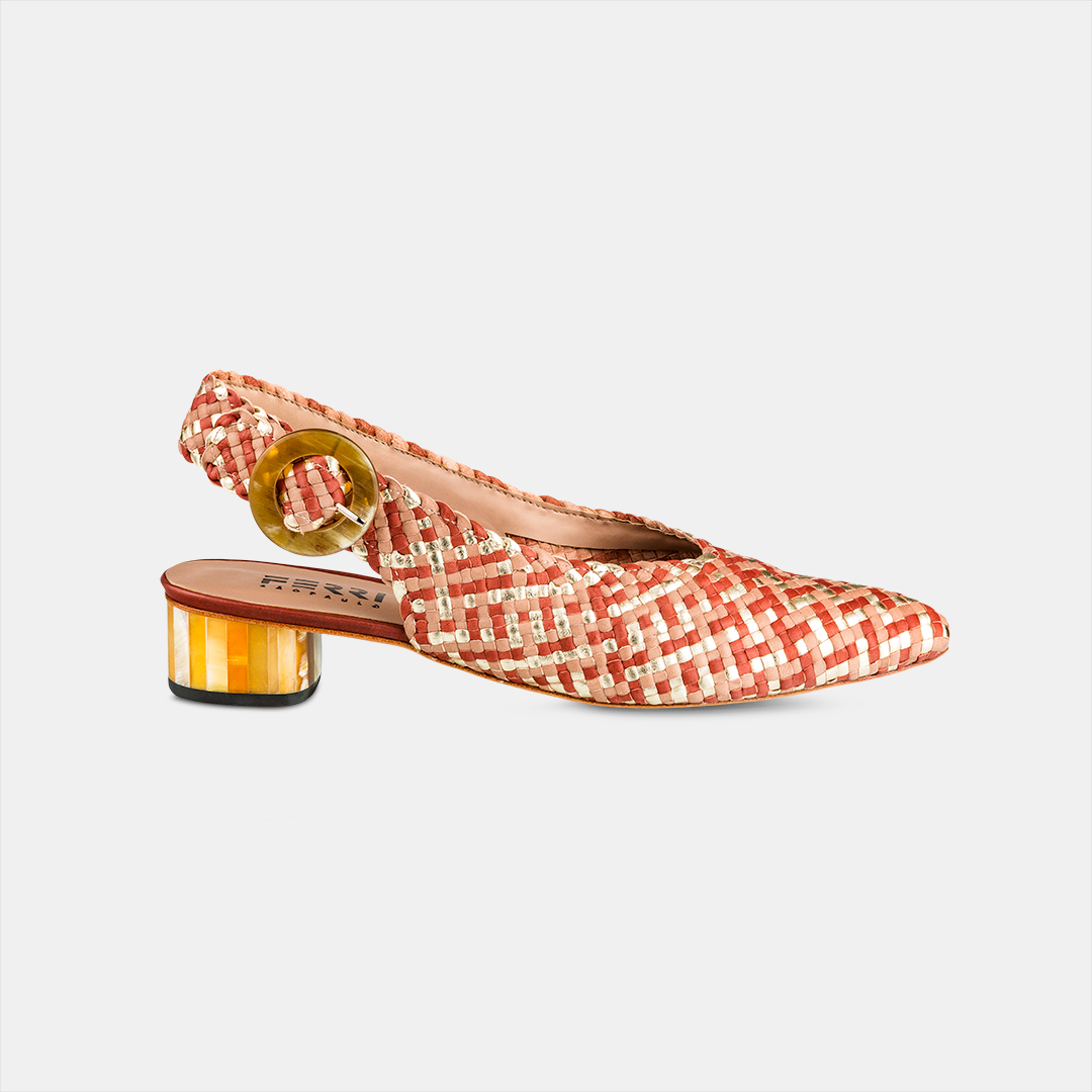 Sapatilha Feminina em Tressê de Couro. Biqueira Fina e Arredondada. Fechamento por Fivela de Marchetaria.