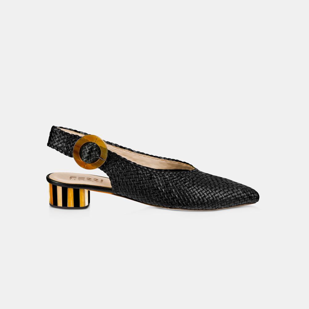 Sapatilha Feminina em Tressê de Couro. Biqueira Fina e Arredondada. Fechamento por Fivela de Marchetaria.